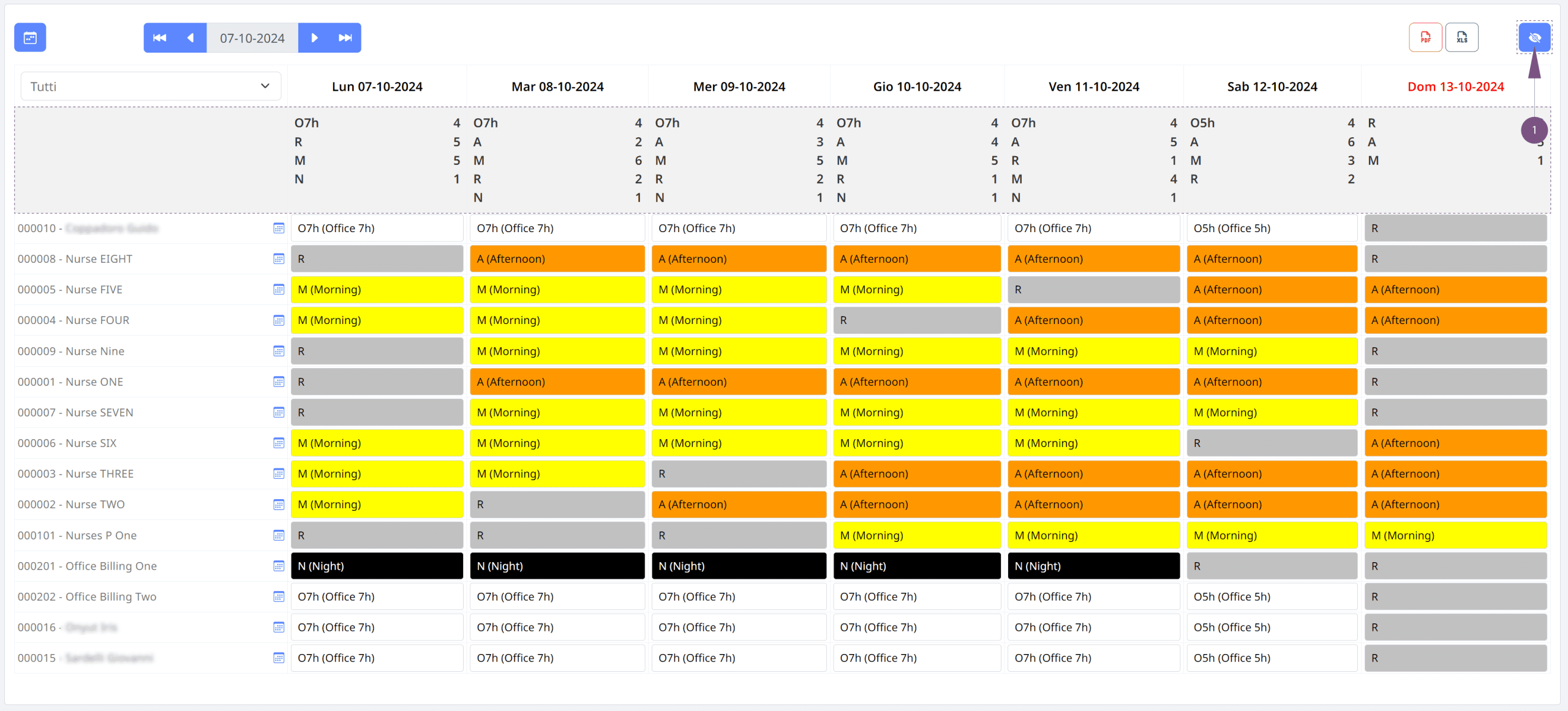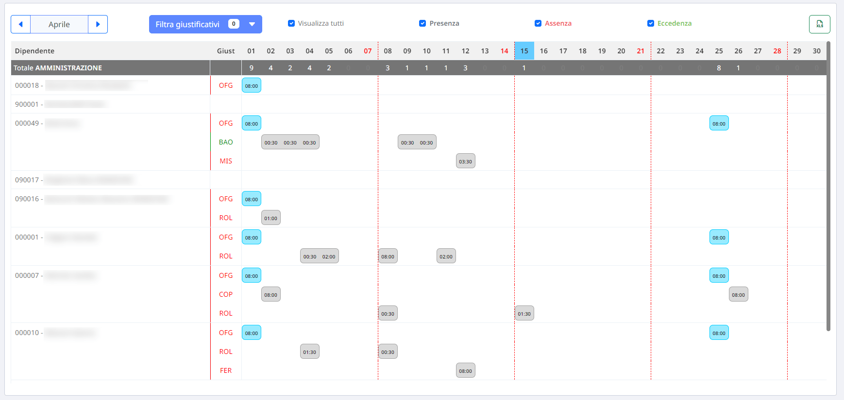 La schermata Planning consente di gestire e monitorare le presenze, le assenze, le eccedenze e le malattie di ciascun dipendente. Presentata in formato tabellare, questa schermata fornisce un riepilogo mensile delle ferie, dei permessi e dei giustificativi che i dipendenti possono richiedere. È possibile assegnare un colore per distinguere i diversi tipi di giustificativi.