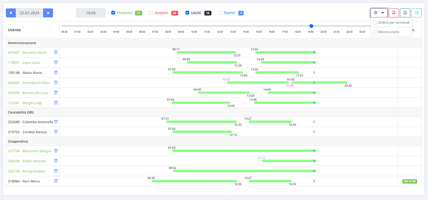 Puoi supervisionare lo stato delle presenze e degli orari svolti globale, o suddiviso per reparto anche da più dispositivi contemporaneamente.